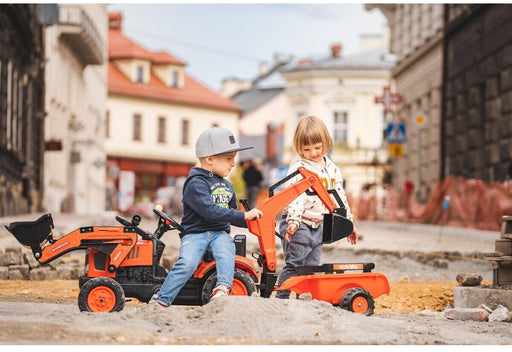 Falk Trettraktor Kubota mit Anhänger, Frontlader und Baggerarm